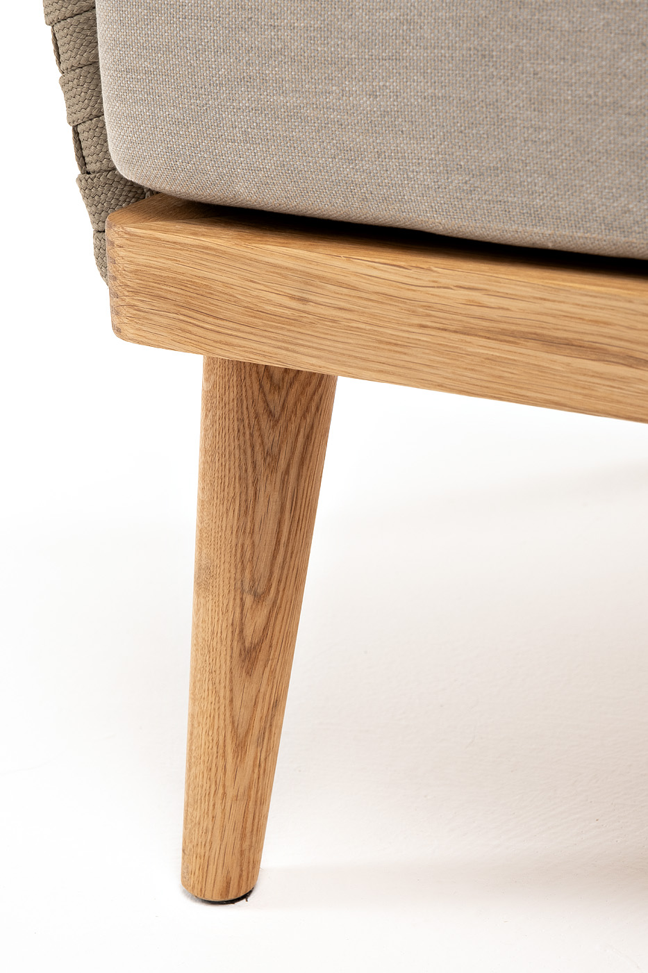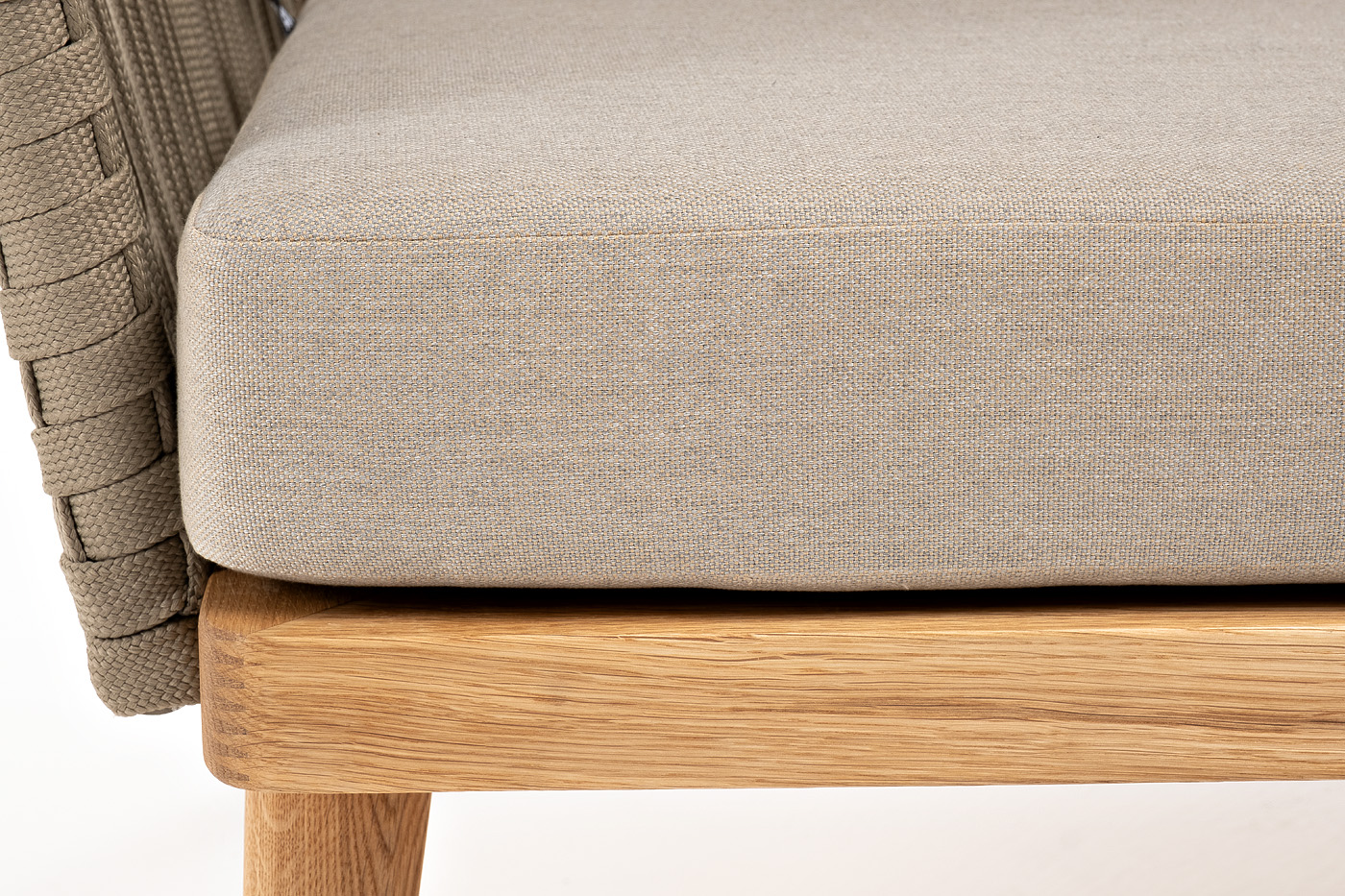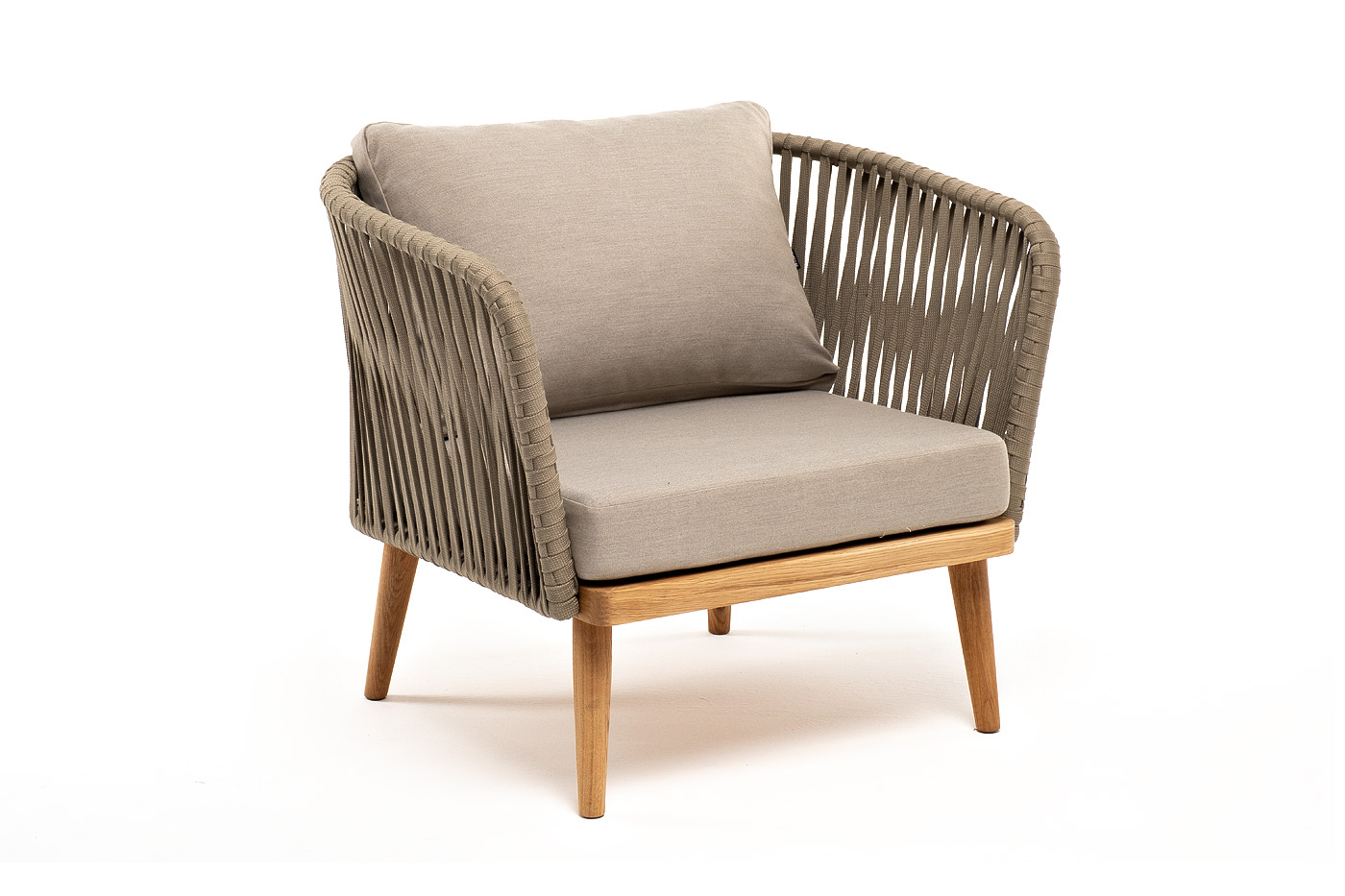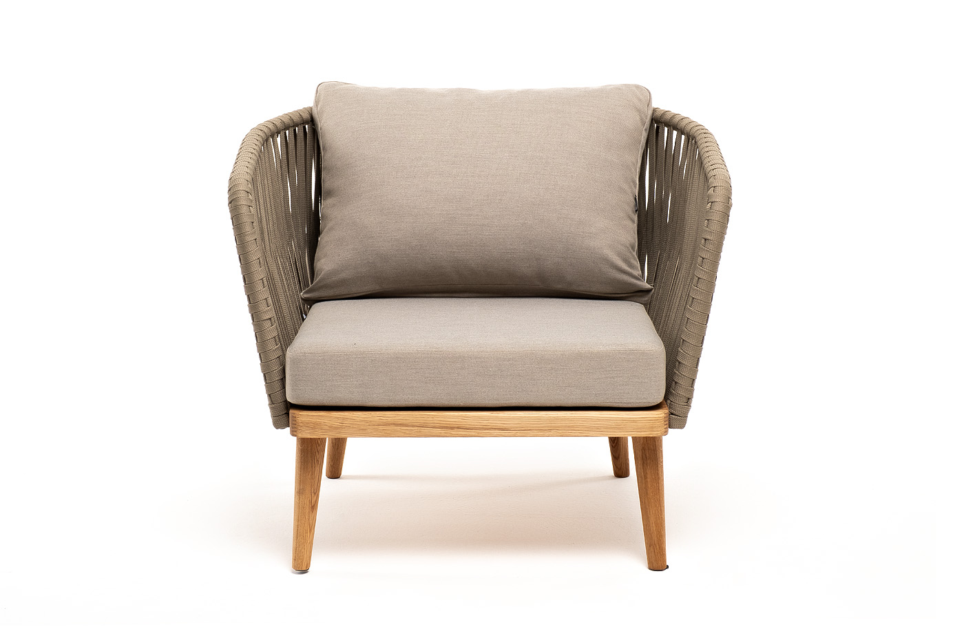 "Мальорка" кресло плетеное из роупа, основание дуб, роуп серо-коричневый 23мм, ткань бежевая 052