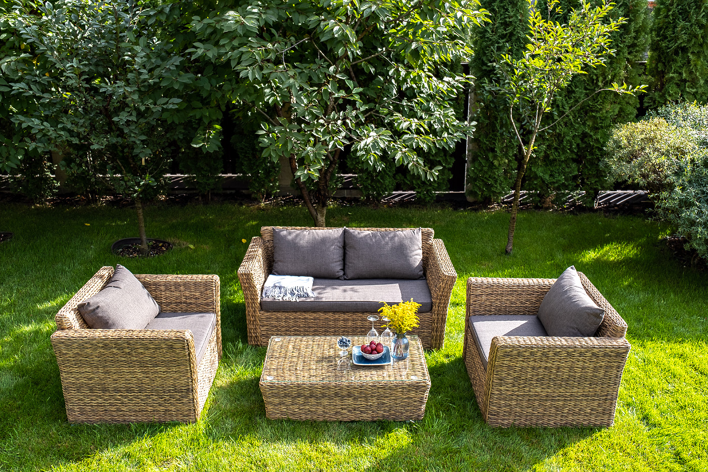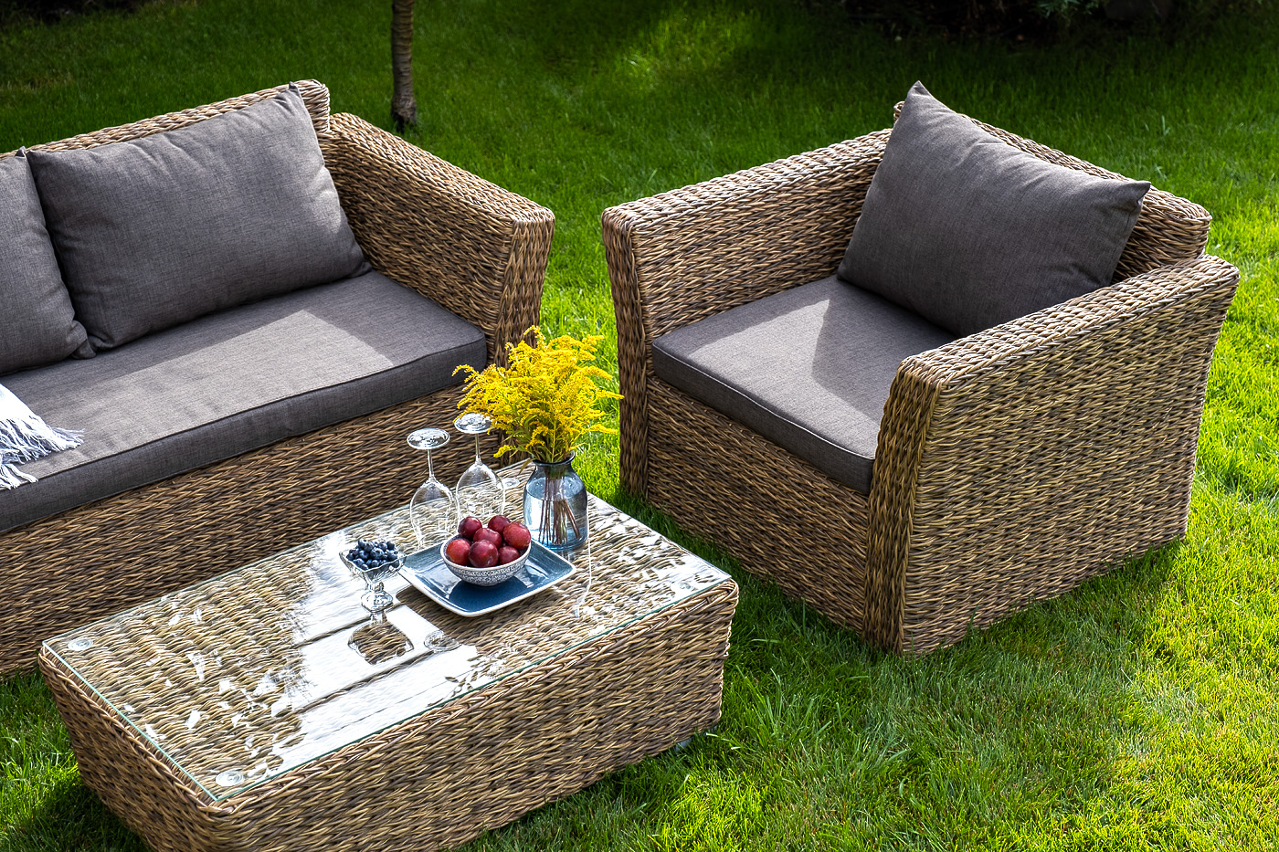 Каркас изготовлен из прочного алюминия, оплетенного вручную искусственным ротангом вида «гиацинт» соломенного оттенка.