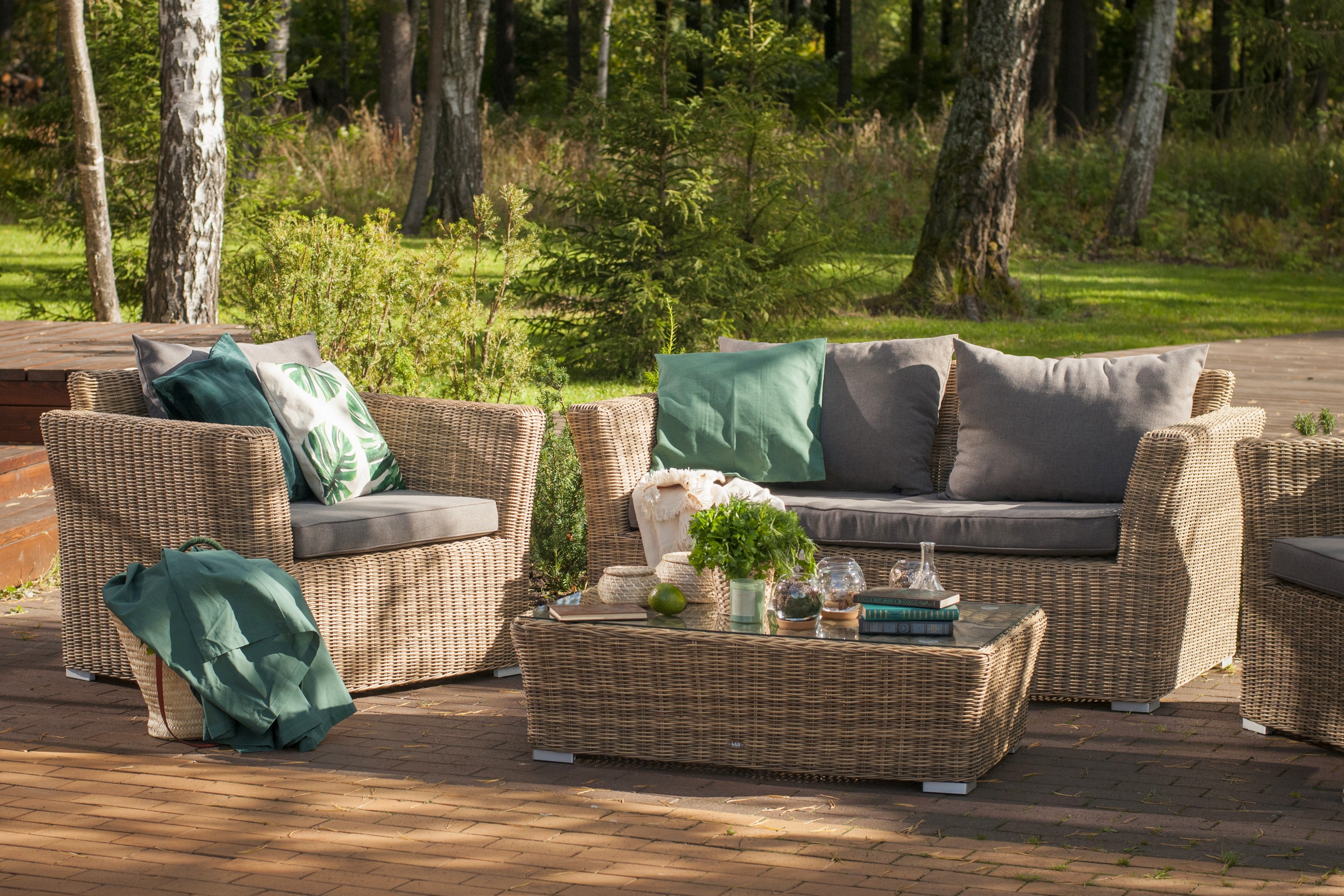 Более комфортной лаунж-зону делают мягкие подушки с чехлами из серо-коричневого полиэстера. Его плотность находится в рамках 230гр/м2. Ткань предварительно обрабатывается влагоотталкивающими составами.