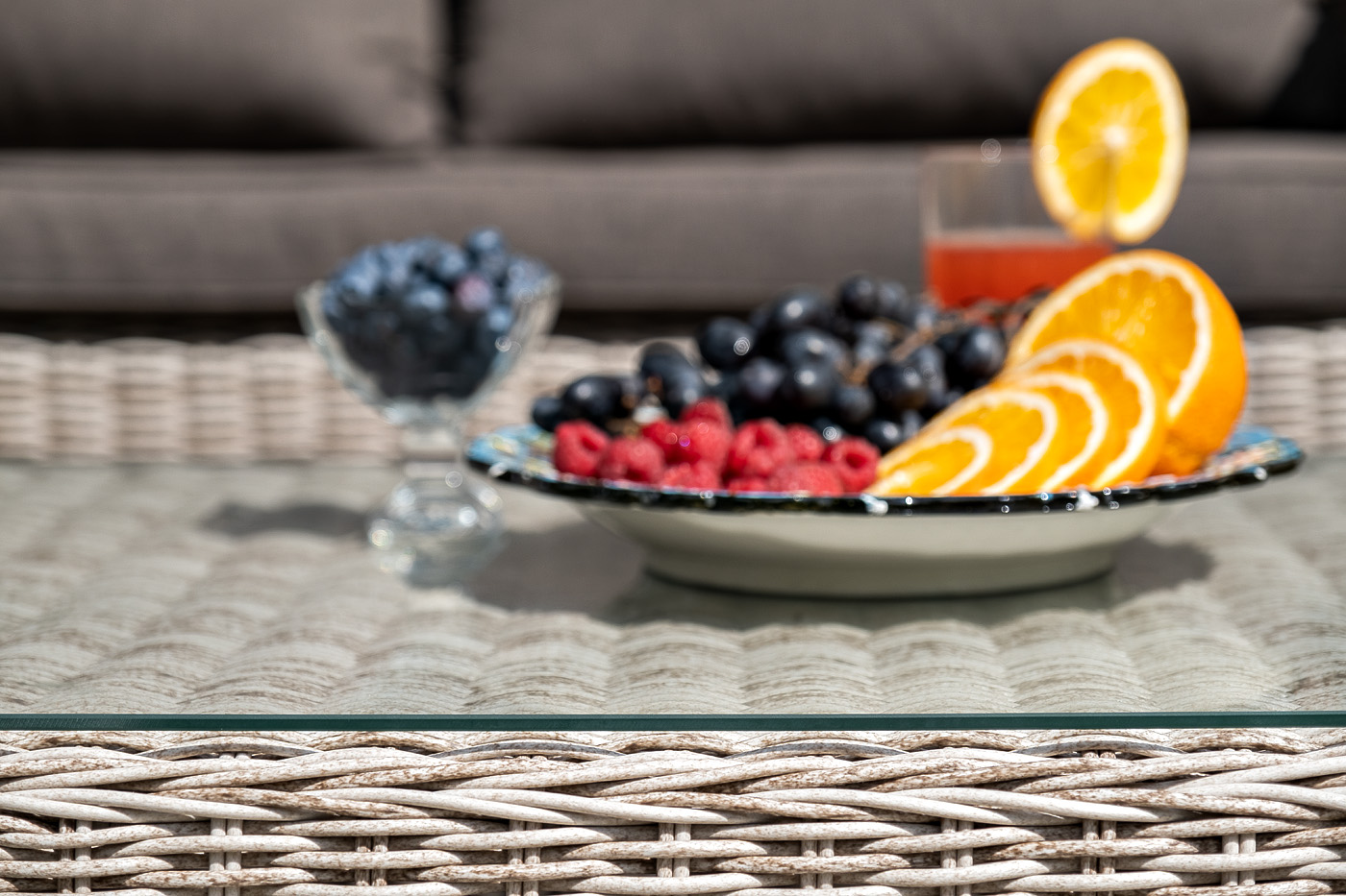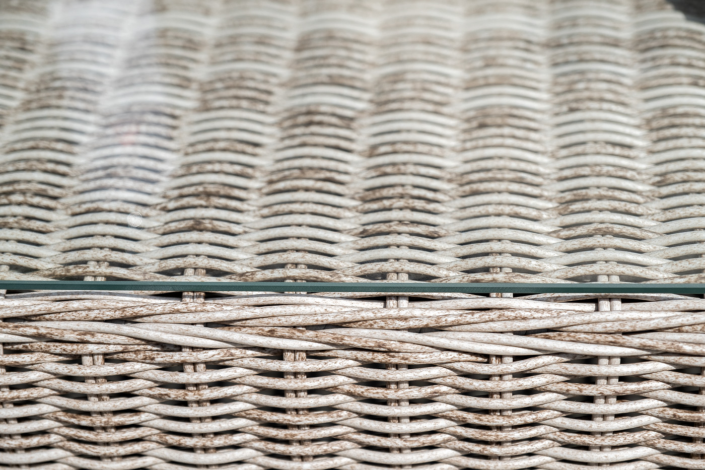 Прочный алюминиевый каркас усиливает устойчивость мебели. Его дополняет бежевая оплетка, которая представлена из круглого искусственного ротанга.