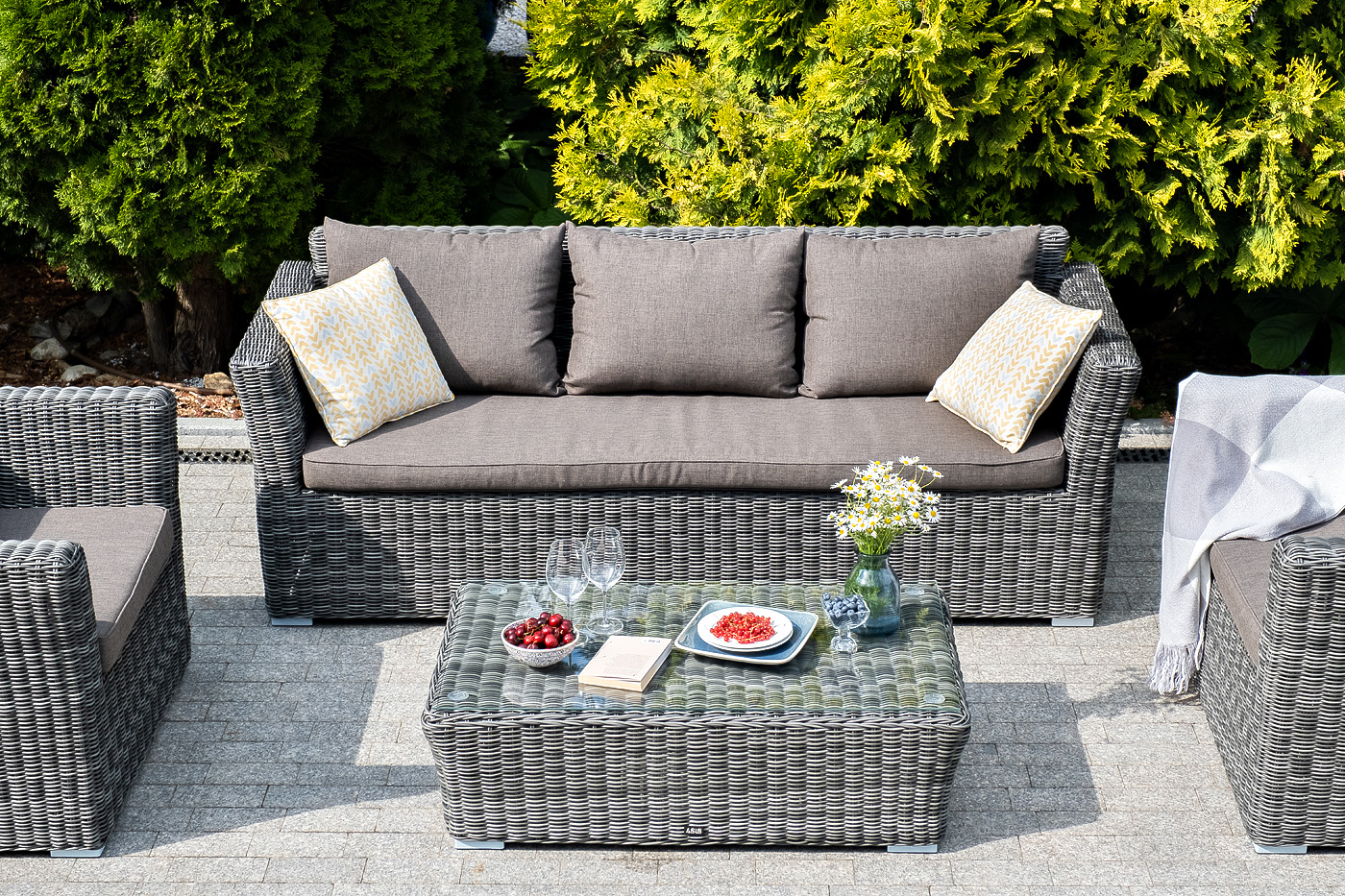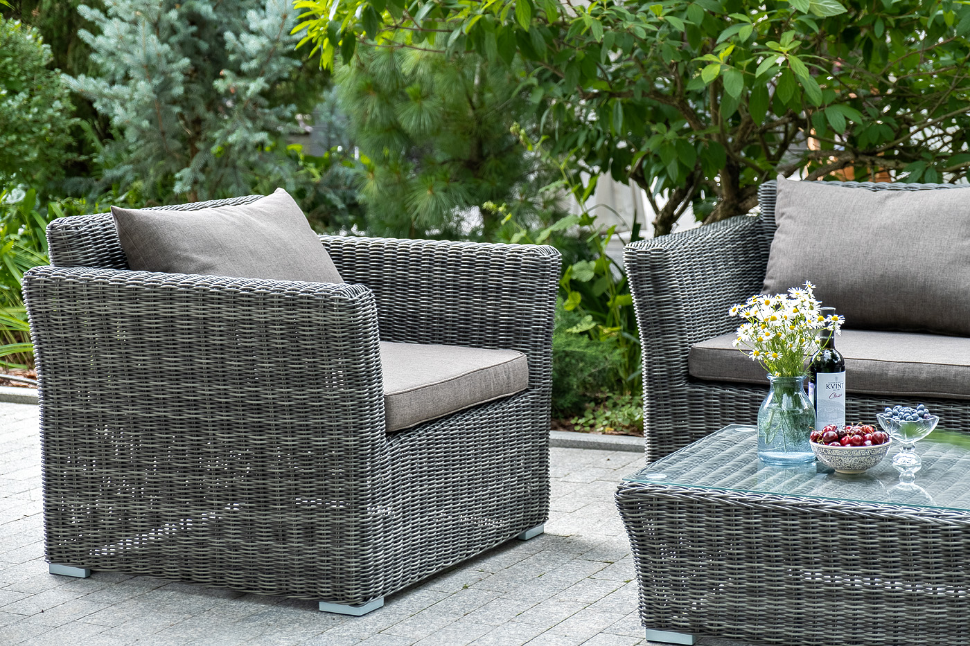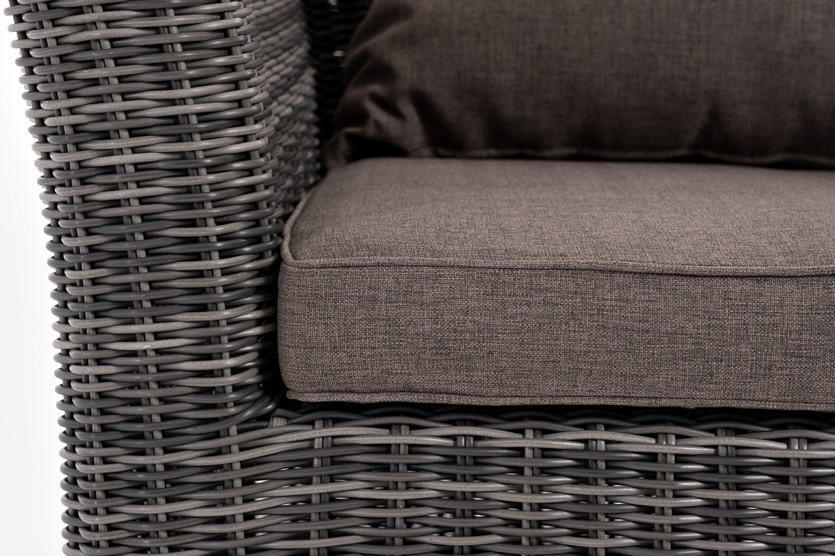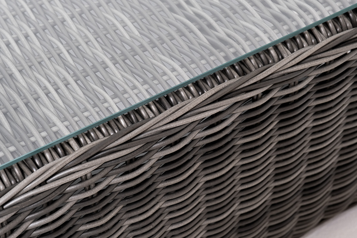 Из алюминия сделан устойчивый каркас мебели. Ее поверхность дополнена искусственным ротангом, из которого сделано ручное плетение, цвет "графит".