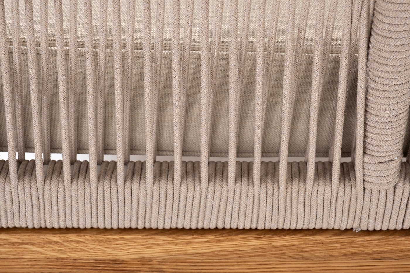 Боковины каркаса вручную оплетены роупом - эластичными синтетическими лентами, изготовленными из высокопрочных полиэфирных волокон. Цвет оплетки - бежевый. Основание дуб.